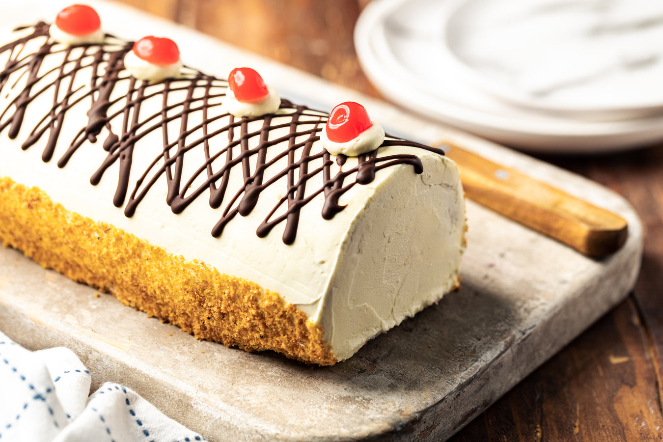 Brazo gitano de vainilla relleno con mermelada de fresa cubierto crema de vainilla.