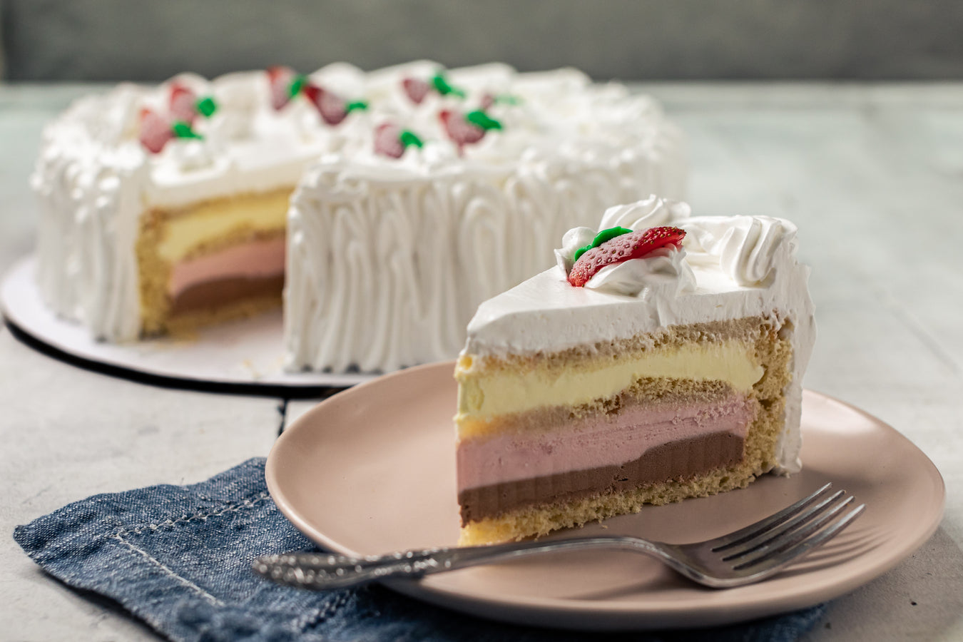 Tres capas de helado sabores, vainilla, chocolate y fresa, con Bizcocho de vainilla y cubierto de turrón.