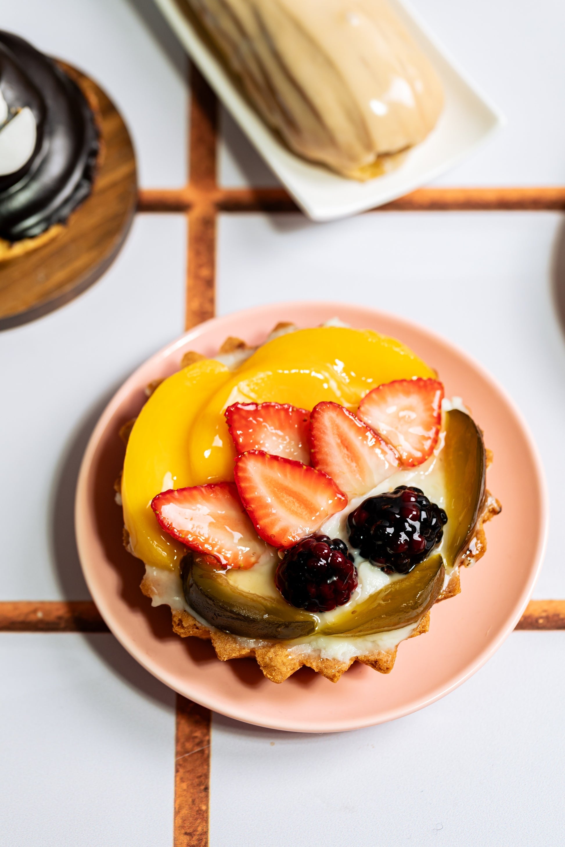 Tartaleta relleno con manjar de queso y decorado con frutas de temporada