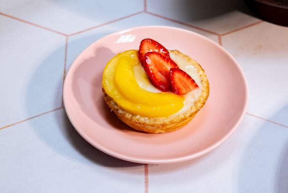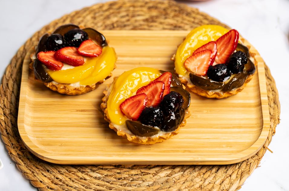 Tartaleta Mediana rellena con manjar de queso y decorado con frutas de temporada