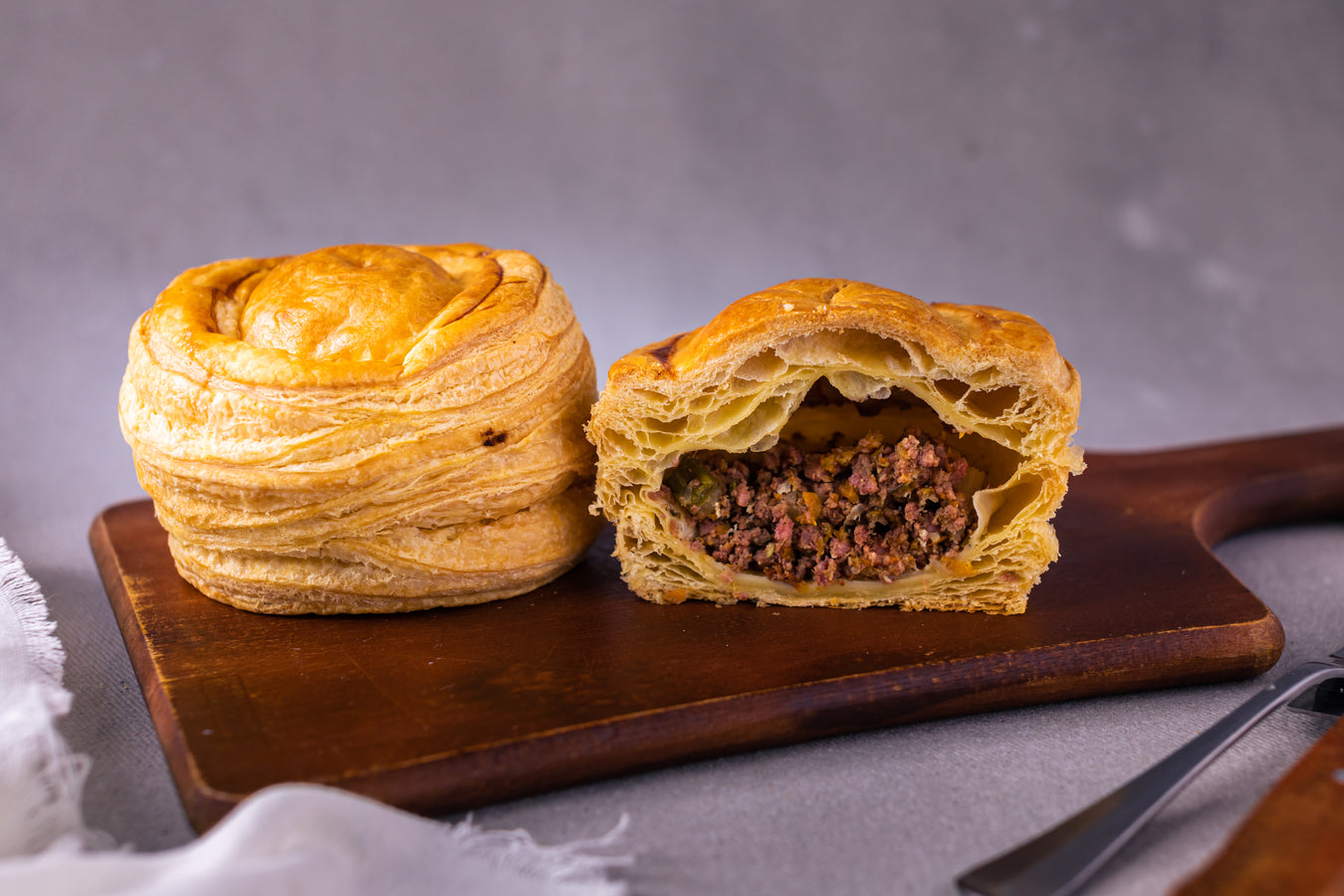 Base de masa hojaldre horneada rellena con carne de res y verduras