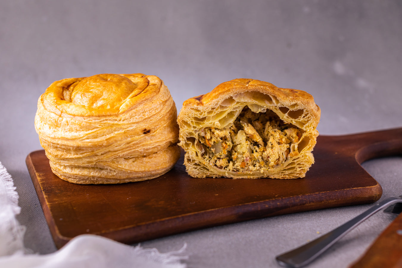 Base de masa hojaldre horneada rellena con pollo y verduras